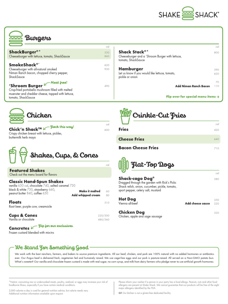 Allergens calories in our food and drink. Shake Shack Gluten Free. Whether youre trying to make healthier choices or simply.